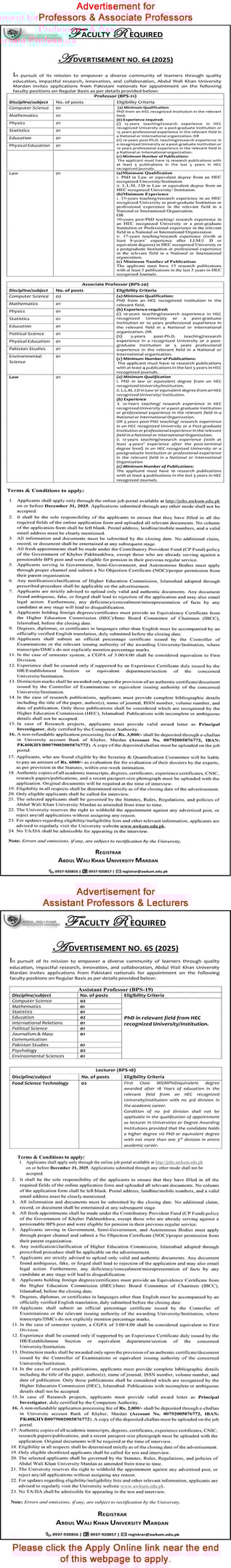 Abdul Wali Khan University Mardan Jobs December 2025 Apply Online Teaching Faculty AWKUM Latest